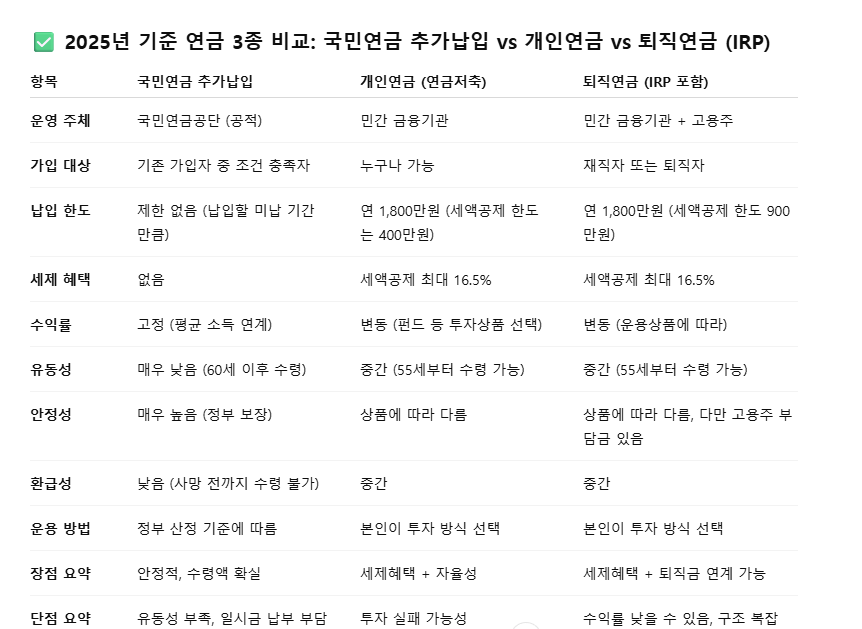 - 국민연금 추가납입은 가장 안정적이지만 유동성이 떨어지고 세제 혜택이 없습니다.